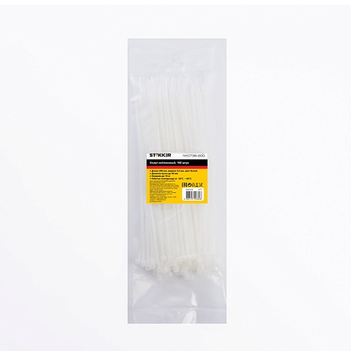 Характеристики Хомут нейлоновый STEKKER NYCT36-200 3,6x200 мм, d пучка max 50 мм, нагрузка 18 кг, белый, упаковка 100 шт