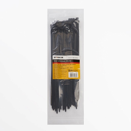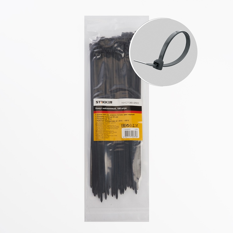 Отзывы о Хомут нейлоновый STEKKER NYCT36-250 3,6x250 мм, d пучка max 65 мм, нагрузка 18 кг, черный, упаковка 100 шт