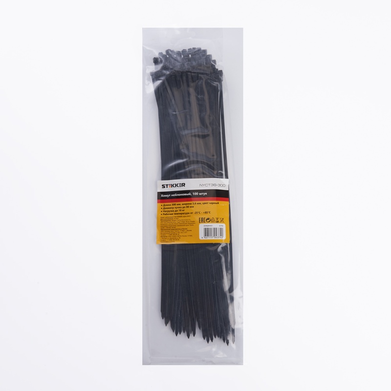 Хомут нейлоновый STEKKER NYCT36-300 3,6x300 мм, d пучка max 80 мм, нагрузка 18 кг, черный, упаковка 100 шт