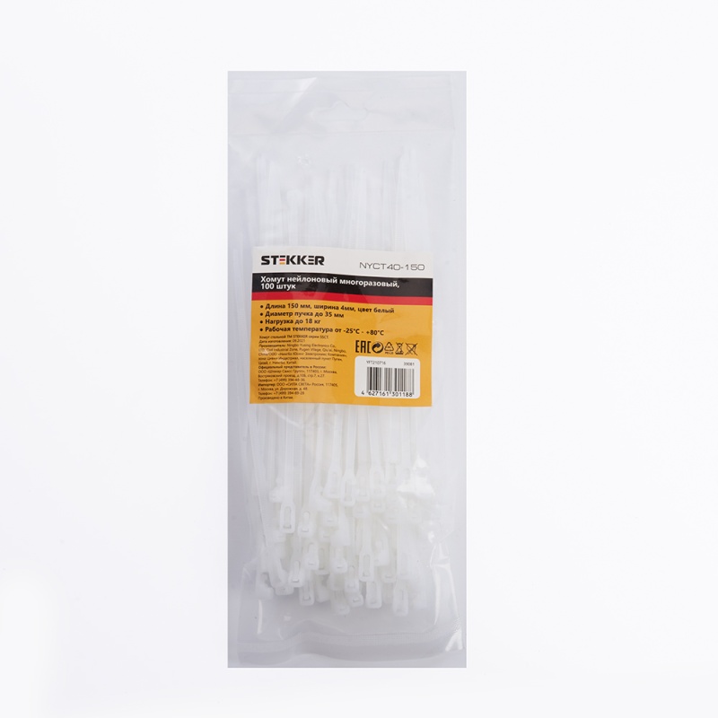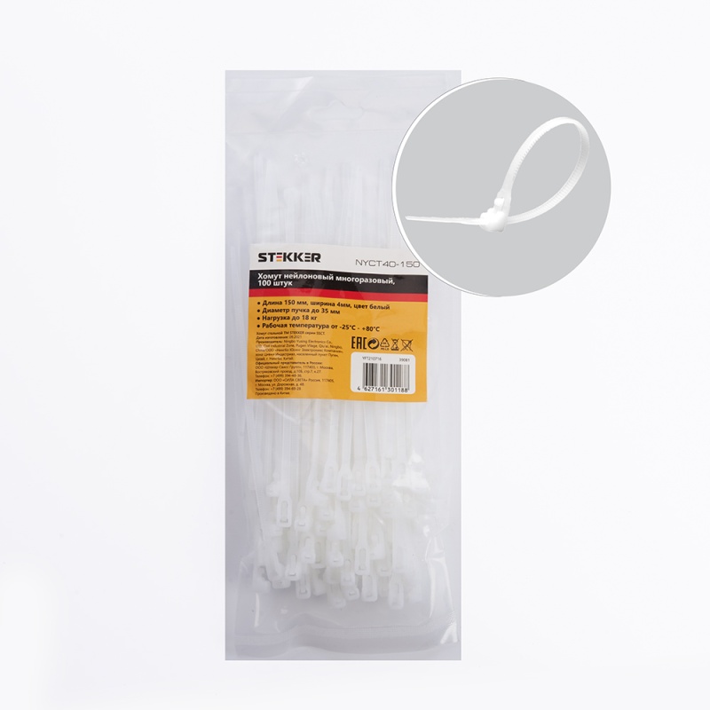Характеристики Хомут нейлоновый многоразовый STEKKER NYCT40-150 4x150 мм, белый, упаковка 100 шт