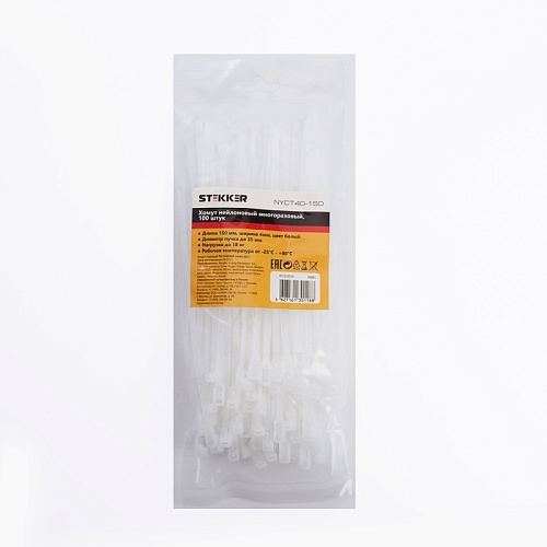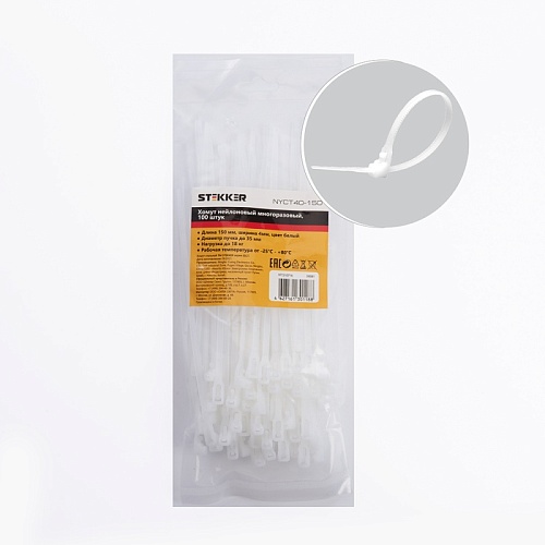 Хомут нейлоновый многоразовый STEKKER NYCT40-150 4x150 мм, белый, упаковка 100 шт