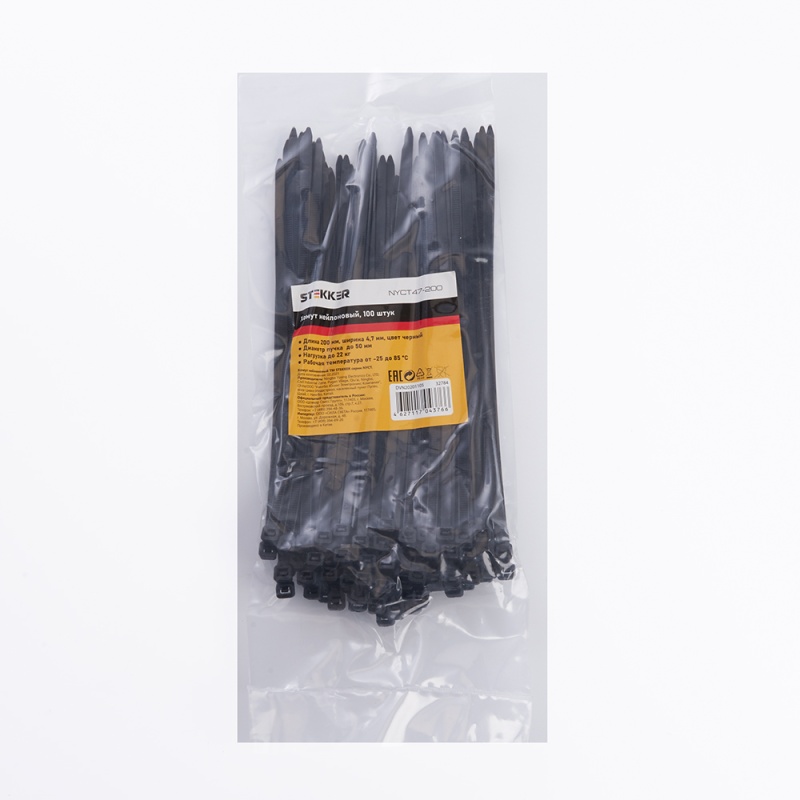 Характеристики Хомут нейлоновый STEKKER NYCT47-200 4,7х20 мм, d пучка max 50 мм, нагрузка 22кг, черный, упаковка 100 шт