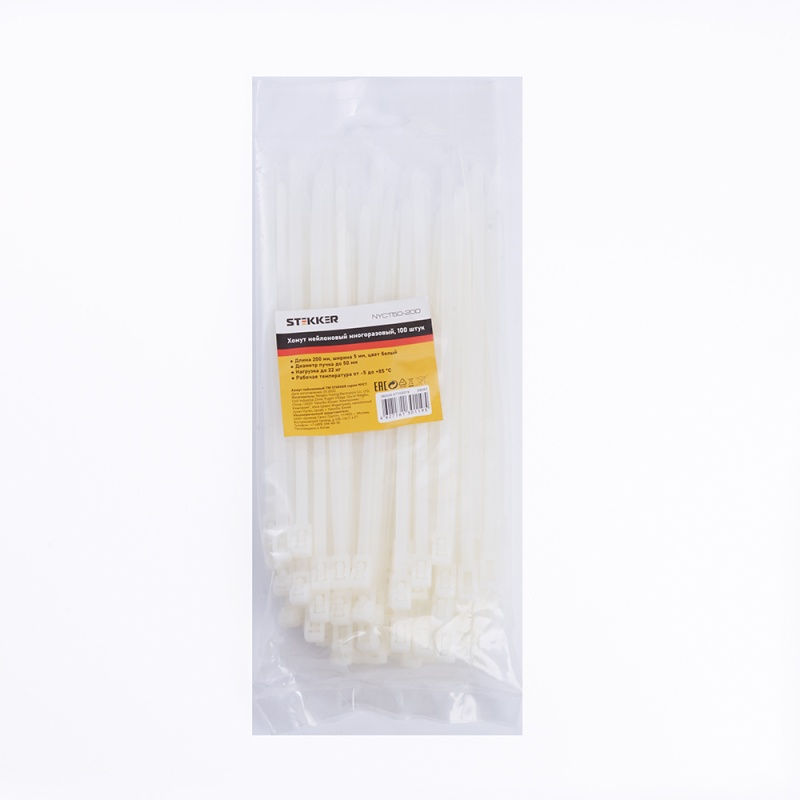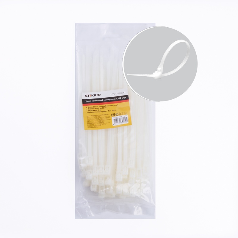 Характеристики Хомут нейлоновый многоразовый STEKKER NYCT50-200 5x200 мм, белый, упаковка 100 шт