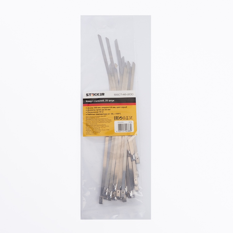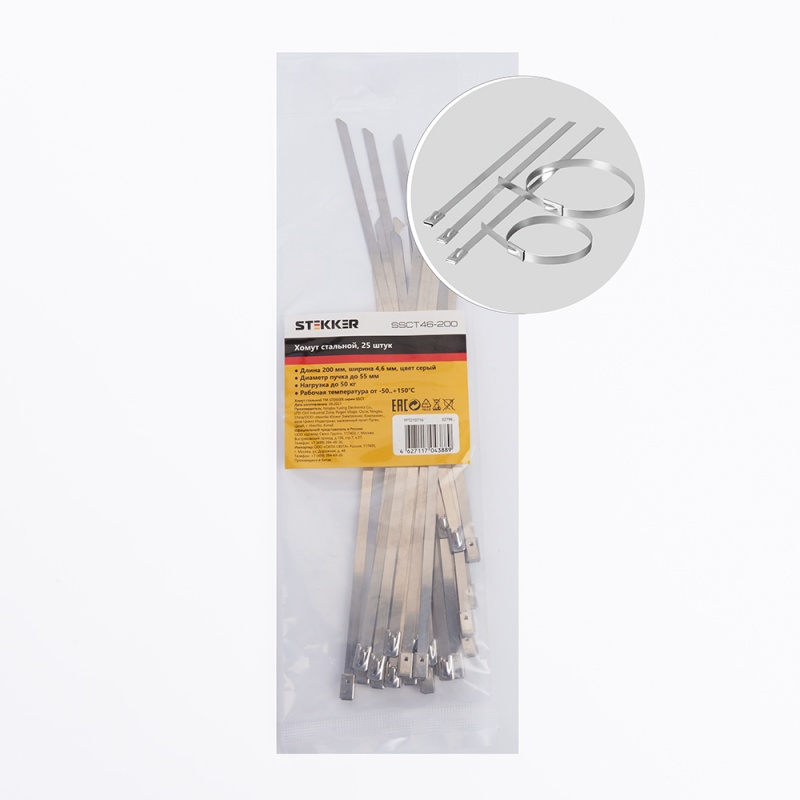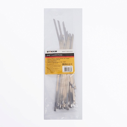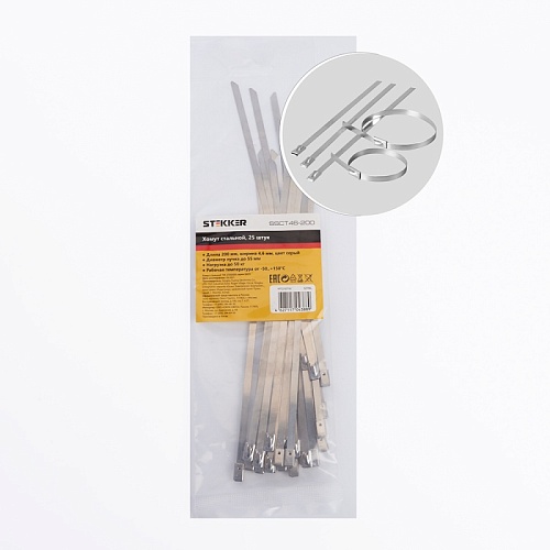 Характеристики Хомут стальной STEKKER SSCT46-200 4,6х200мм, d пучка max 55мм, нагрузка 50кг, серый, упаковка 25 шт