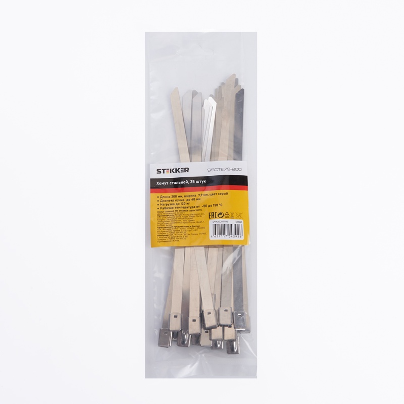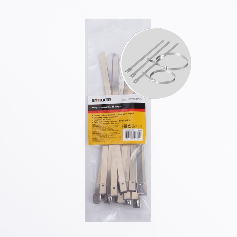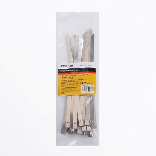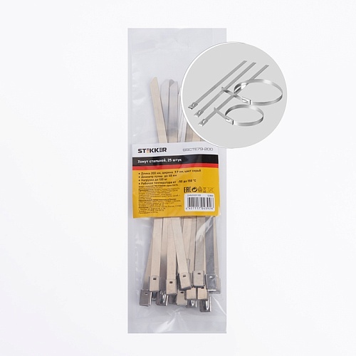 Характеристики Хомут стальной STEKKER SSCTE79-200 7.9х200мм, d пучка max 48мм, нагрузка 120кг, серый, упаковка 25 шт