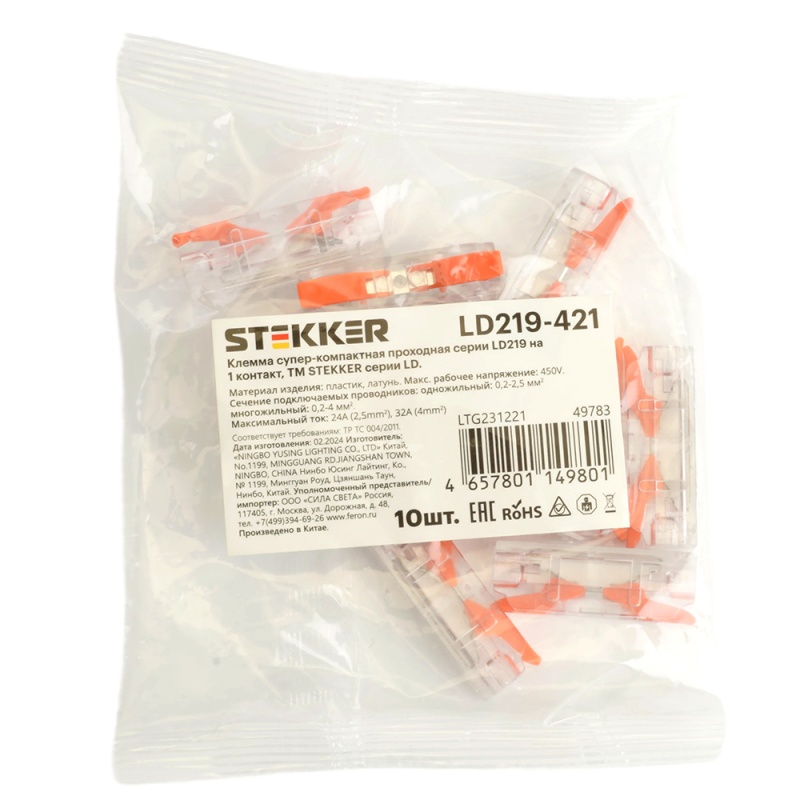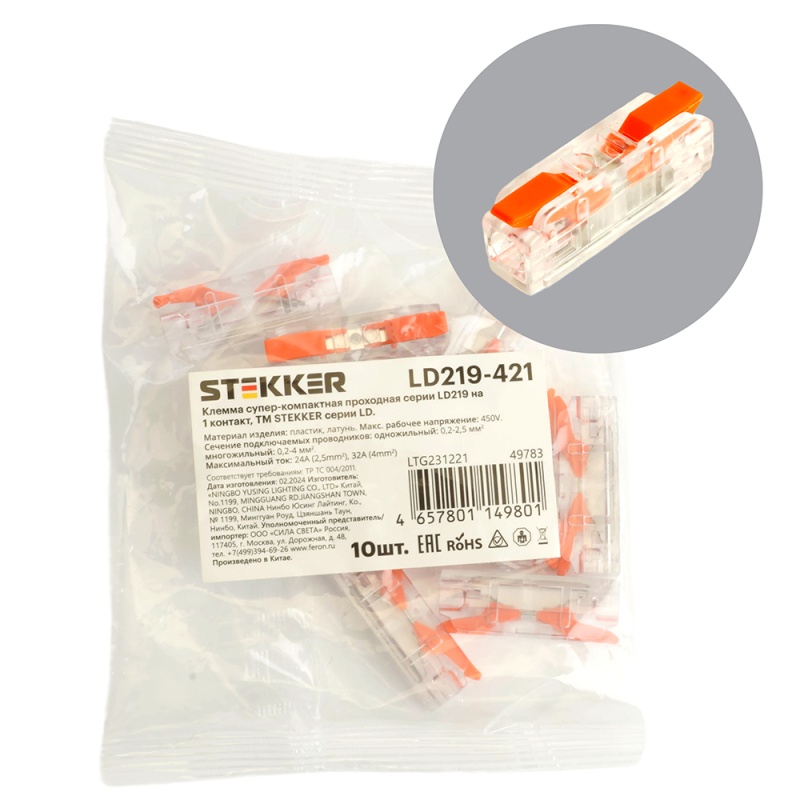 Характеристики Клемма супер-компактная проходная серии 219 на 1 контакт STEKKER,LD219-421, 1ввод,1вывод на полюс (DIY упак 10 шт)
