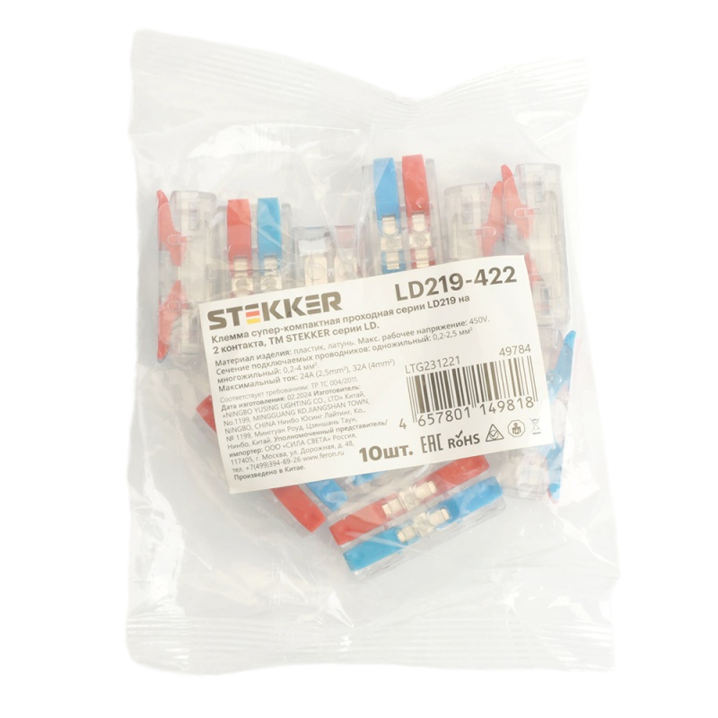 Характеристики Клемма супер-компактная проходная серии 219 на 2 контакта STEKKER,LD219-422, (DIY упак 10 шт)