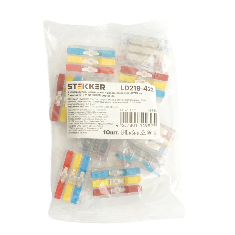 Характеристики Клемма супер-компактная проходная серии 219 на 3 контакта STEKKER,LD219-423, (DIY упак 10 шт)