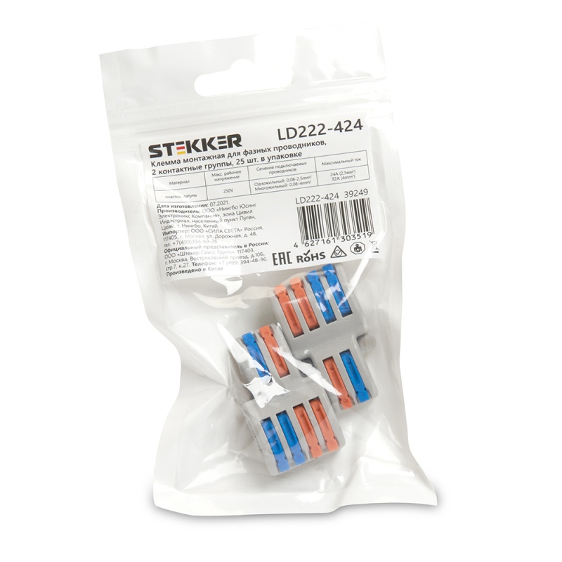 Характеристики Клемма монтажная д/ подкл. фазн. проводников STEKKER, LD222-424, 2 контактные группы, 1ввод,2вывода на полюс (DIY упак 2 шт)