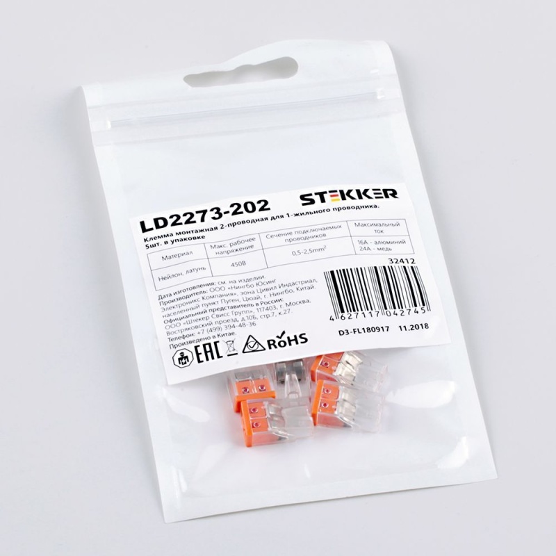 Клемма монтажная 2-проводная STEKKER для 1-жильного проводника, LD2273-202 (5 штук в упаковке) 32412