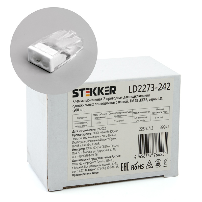 Характеристики Клемма монтажная 2-проводная с пастой STEKKER для 1-жильного проводника, LD2273-242