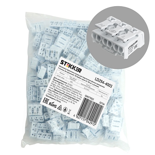 Клемма монтажная STEKKER, LD294-4003, для подключения фазных проводников, 3 контактные группы (3 ввода, 3 вывода на полюс)