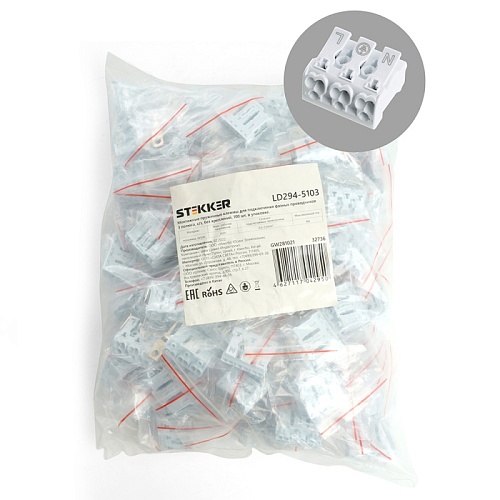 Характеристики Клемма монтажная с/з STEKKER, LD294-5103, для подключения фазных проводников 3 полюса, 3 контактные группы (3 ввода, 3 вывода на полюс)