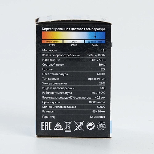 Характеристики Лампа светодиодная Feron LB-37 Шарик E27 1W 6400K прозрачный
