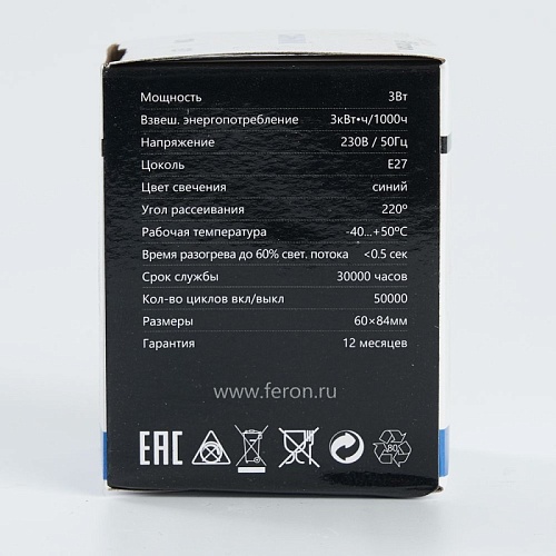 Характеристики Лампа светодиодная Feron LB-371 Шар E27 3W 230V синий