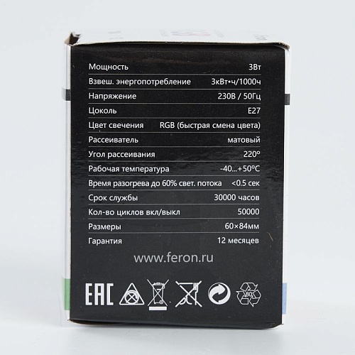 Характеристики Лампа светодиодная Feron LB-371 Шар матовый E27 3W 230V RGB быстрая смена цвета