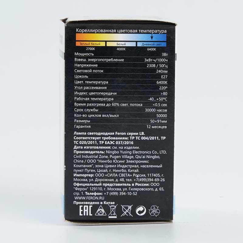 Характеристики Лампа светодиодная Feron LB-375 E27 3W 230V 6400K