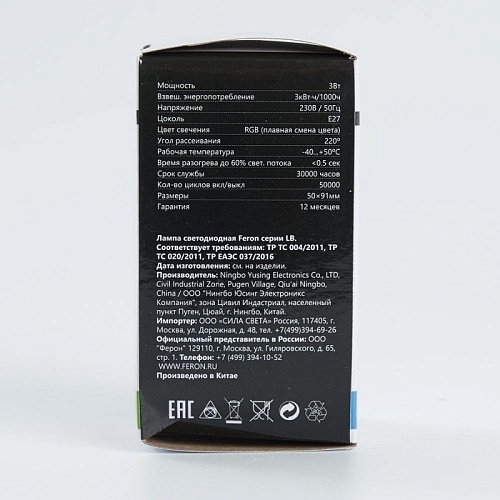 Характеристики Лампа светодиодная Feron LB-375 E27 3W матовый 230V RGB плавная сменая цвета