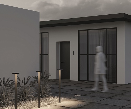 Материал корпуса — металл, цвет — графит. Высокий уровень защиты от пыли и влаги IP 65. Устойчивость к коррозии и перепадам температур. LED-источник света с нейтральной цветовой температурой 3000 К. Серия включает настенные и ландшафтные светильники.