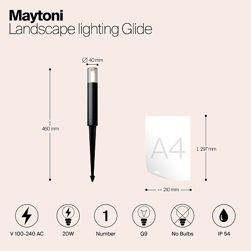 Материал корпуса – алюминий, цвет - графит. Плафон - прочное тонированное стекло. Источник света - лампа с цоколем G9. Серия для маркерной и декоративной подсветки дорожек и ландшафта. Степень защиты - IP54.
