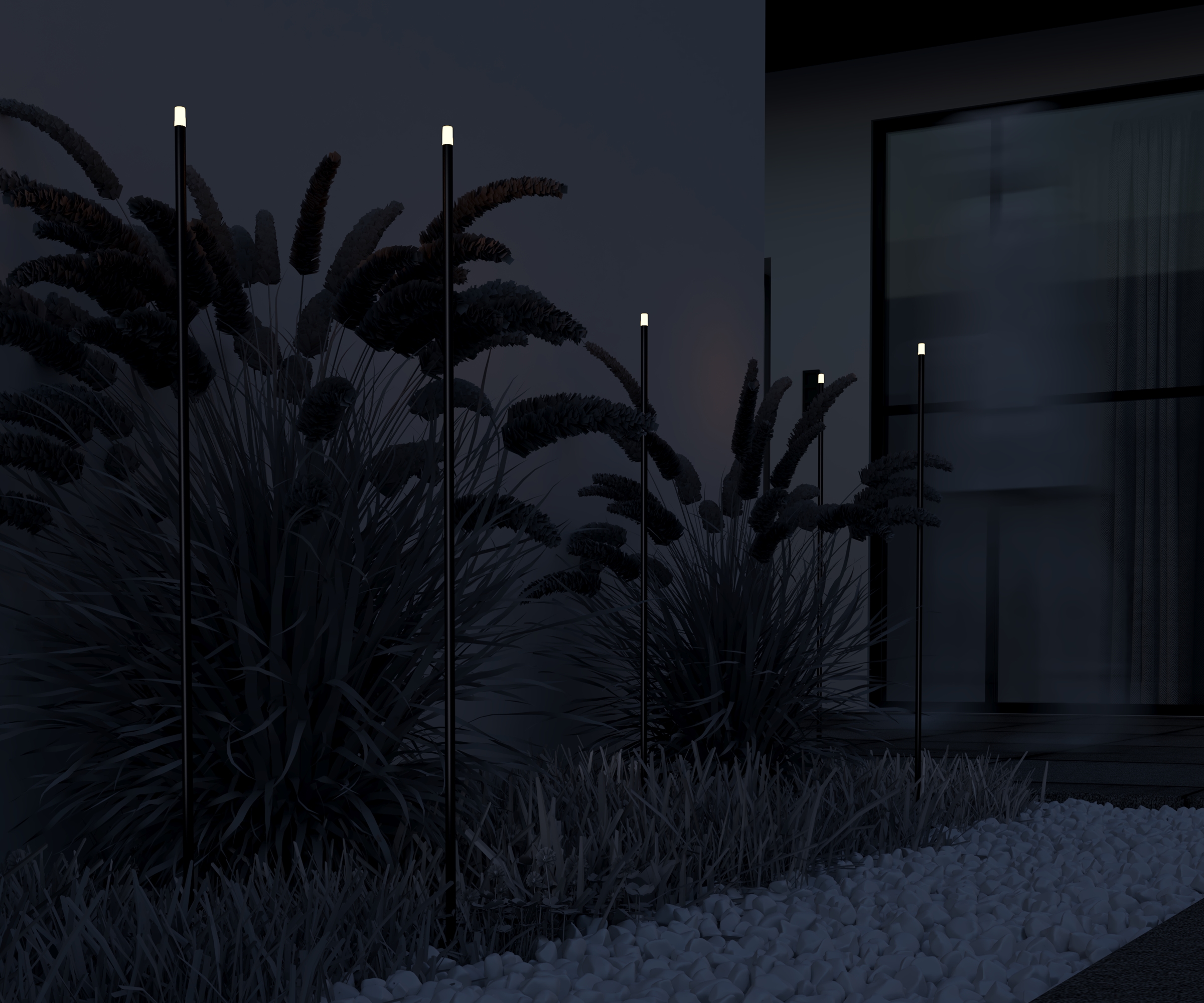 Металлический корпус, цвет - графит. Белый акриловый рассеиватель. Узкий цилиндрический светильник для подсветки растительных насаждений - цветов, кустарников, деревьев, газонов. Установка в грунт. Возможность подключения нескольких светильников к одному источнику питания. LED-источник света, цветовая температура - 3000К. Степень защиты - IP65. Питание 24В.