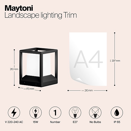 Алюминиевый корпус, цвет - графит. Белый акриловый рассеиватель. Источник света - лампа с цоколем Е27. Высокая степень защиты - IP65. Идеальная подсветка для заборов и различных колонн.