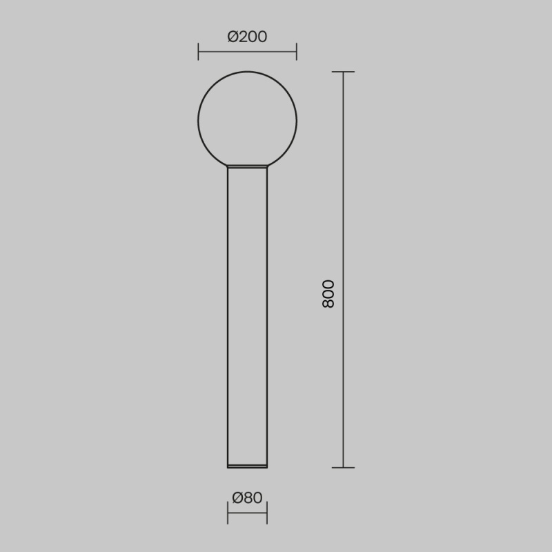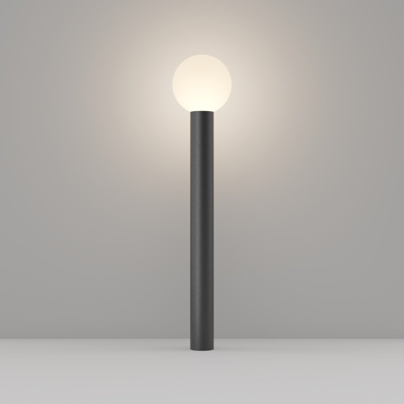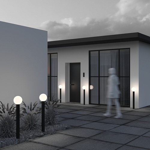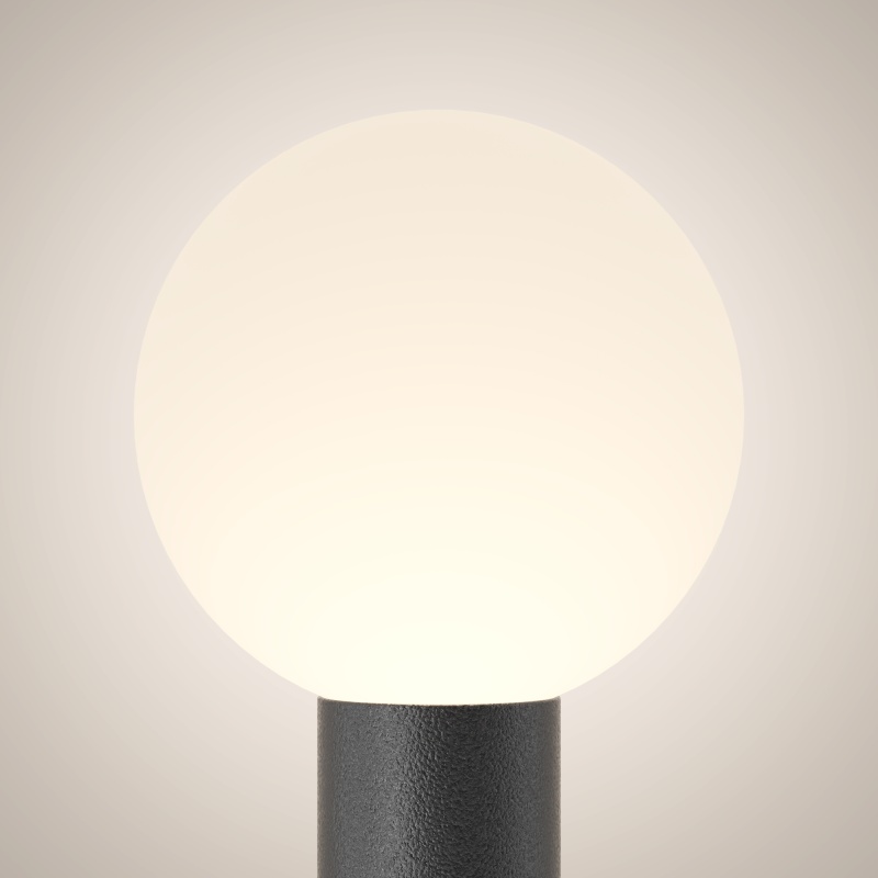 Алюминиевый корпус. Оттенки - черный, серый. Сферические плафоны из белого матового стекла. Защита от коррозии и перападов температур. Высокая степень защиты — IP 54. Источник света — лампа с цоколем E27.
