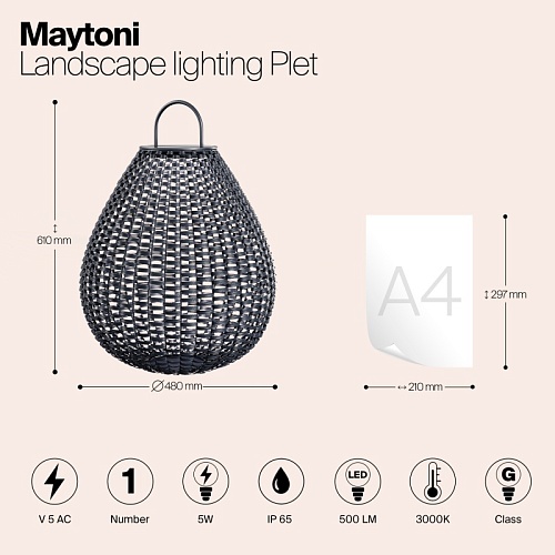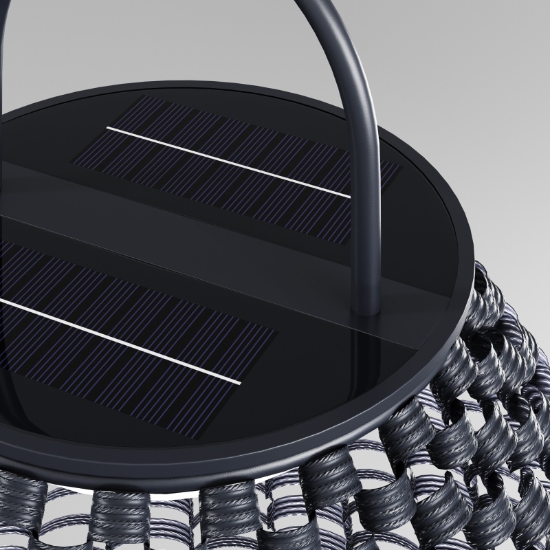 Корпус из ротанга ручного плетения, цвет - черный. Питание от солнечной батареи, время работы - до 12 часов без подзарядки. LED-источник света, цветовая температура - 3000К. Возможность установки в любом месте из-за отсутствия проводов. Удобные ручки для переноски. Высокая степень защиты IP65. Встроенный датчик движения. Серия для декоративной подсветки.