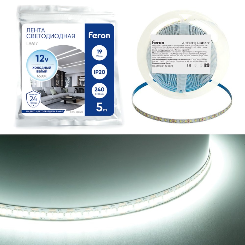 Светодиодная LED лента Feron LS617, 240SMD(2835)/м 19Вт/м 12V 5000*10*1.22мм 6500К, IP20 48828