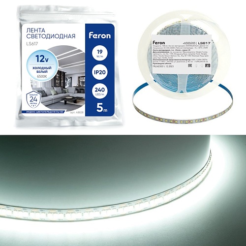 Характеристики Светодиодная LED лента Feron LS617, 240SMD(2835)/м 19Вт/м 12V 5000*10*1.22мм 6500К, IP20