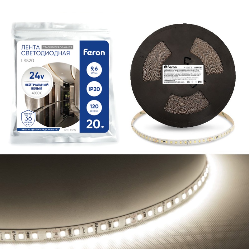 Отзывы о Светодиодная лента Feron LS520 стабилизированная, 120SMD(2835)/м 11Вт/м 24V 20000*10*1.22мм 4000К IP20
