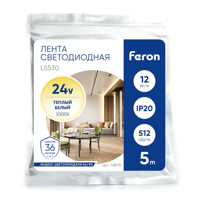 Характеристики Светодиодная COB лента Feron LS530, 512SMD(2110)/м 12Вт/м 24V 5000*10*1.8мм 3000К IP20