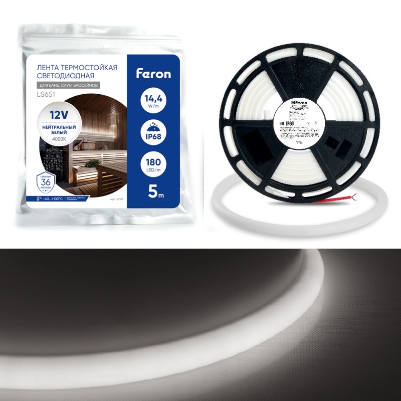 Светодиодная неоновая лента Feron LS651, 180SMD(2835)/m 14,4W/m 12V 5m IP68 ,4000К с 2 заглушками, 2 заглушками c проводом, 10 креплениями в комплекте 32187
