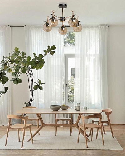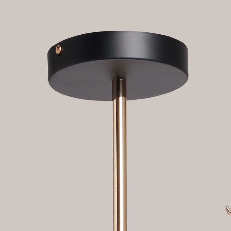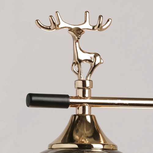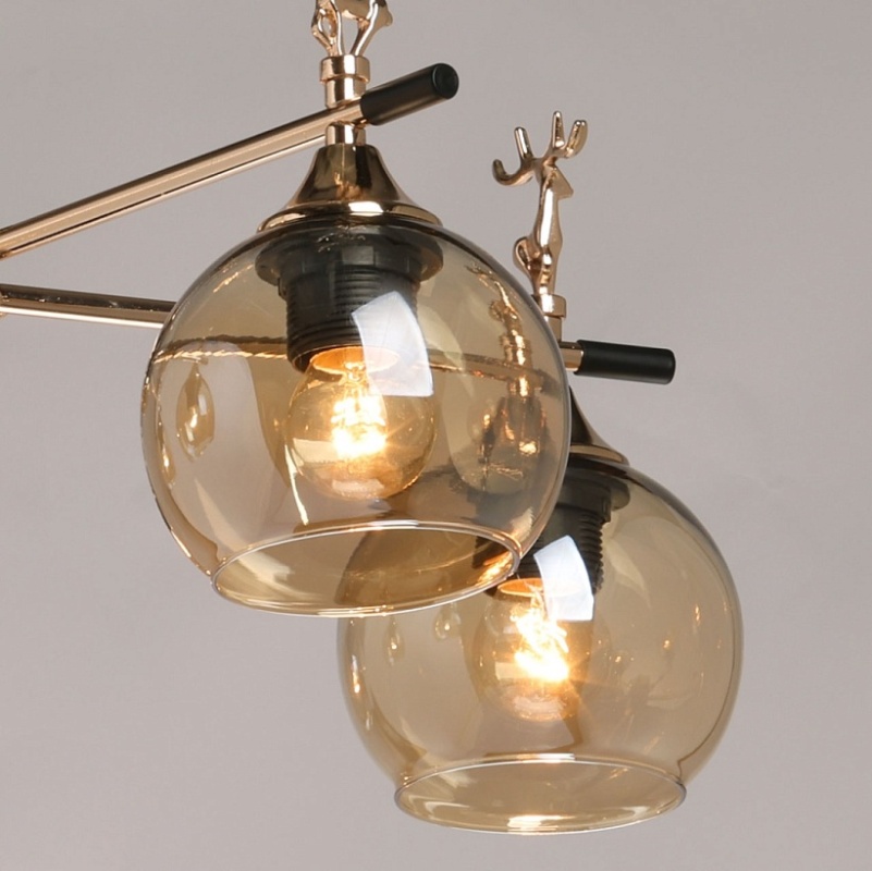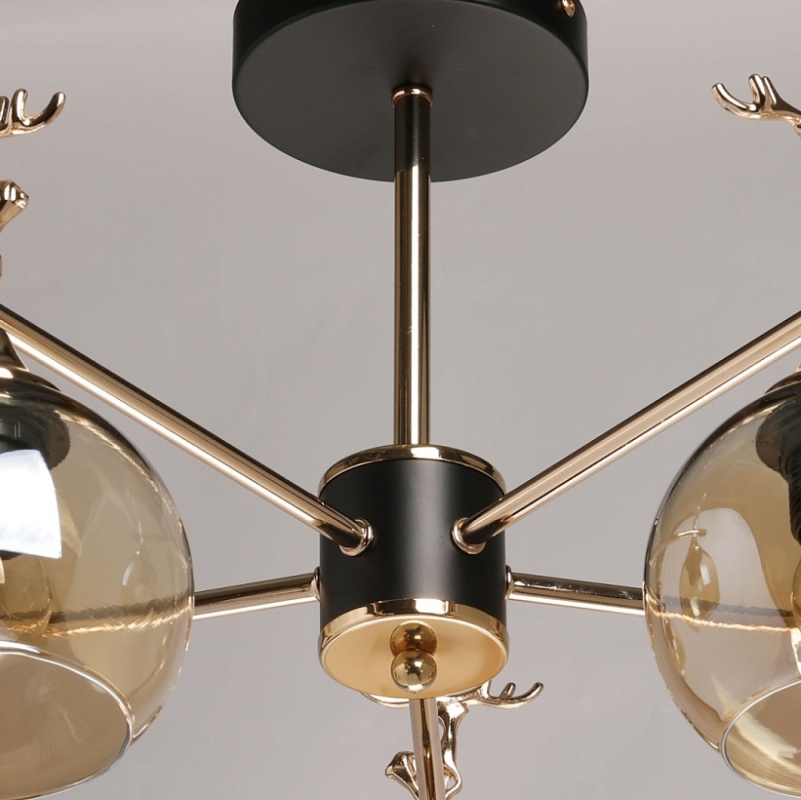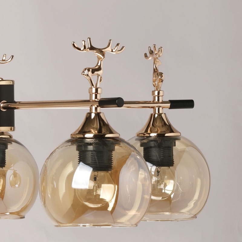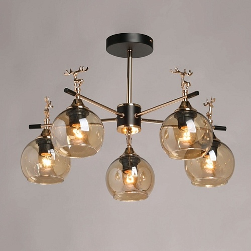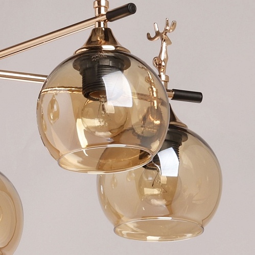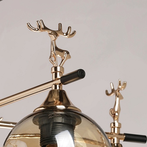 Металлическое основание потолочной люстры окрашено в черный цвет. Отдельные элементы основания гальванизированы в цвет золота. Выдувные вручную стеклянные плафоны гальванизированы в цвет шампань. Люстра декорирована оригинальными фигурками оленей, выполненными из сплава алюминия с цинком по технологии художественного литья и гальванизированными в цвет золота.