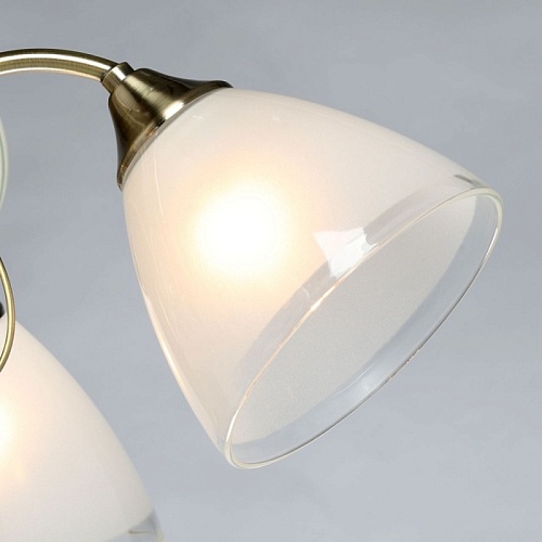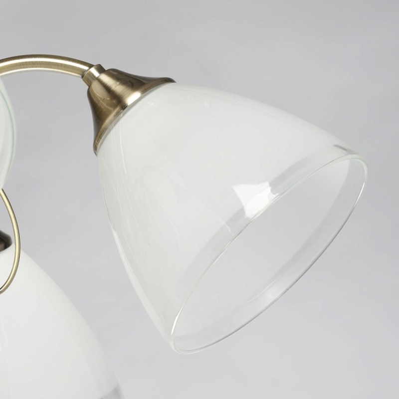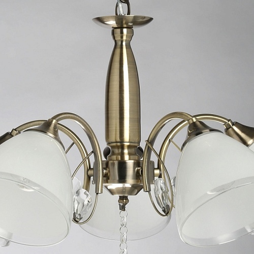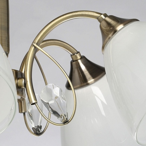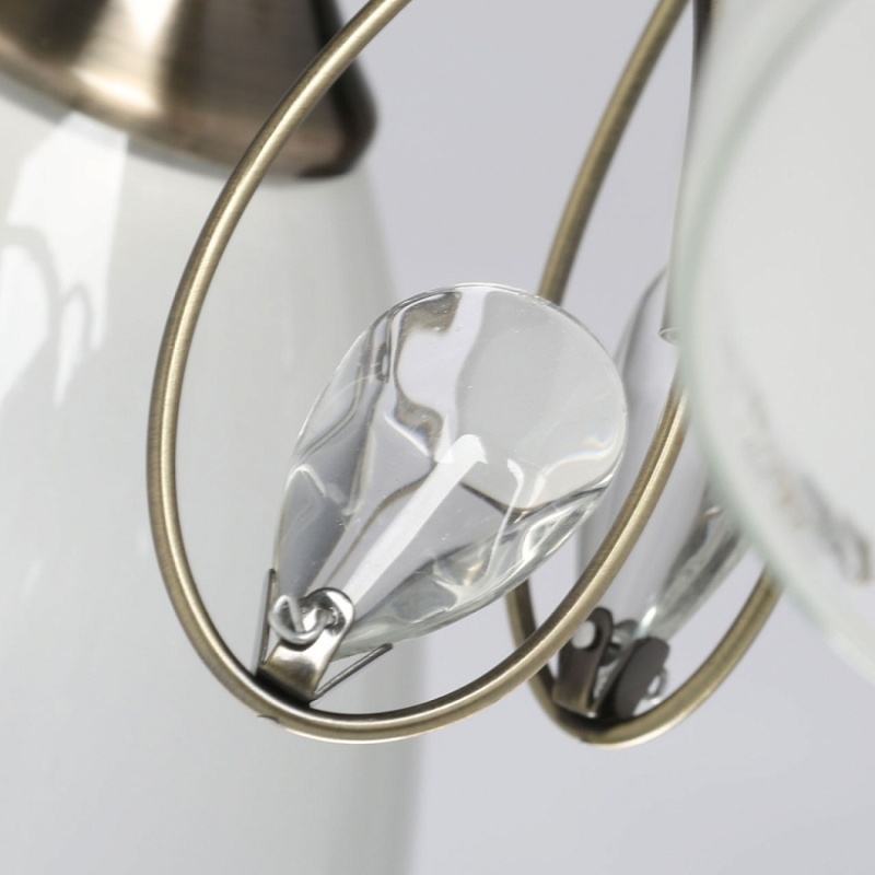 Основание светильника выполнено из металла и гальванизировано в цвет античной бронзы. Стеклянные плафоны выдуваются в форму, матированы. Край плафонов прозрачный. Светильник декорирован хрустальным стеклом миндалевидной формы и хрусталем в форме шара