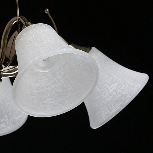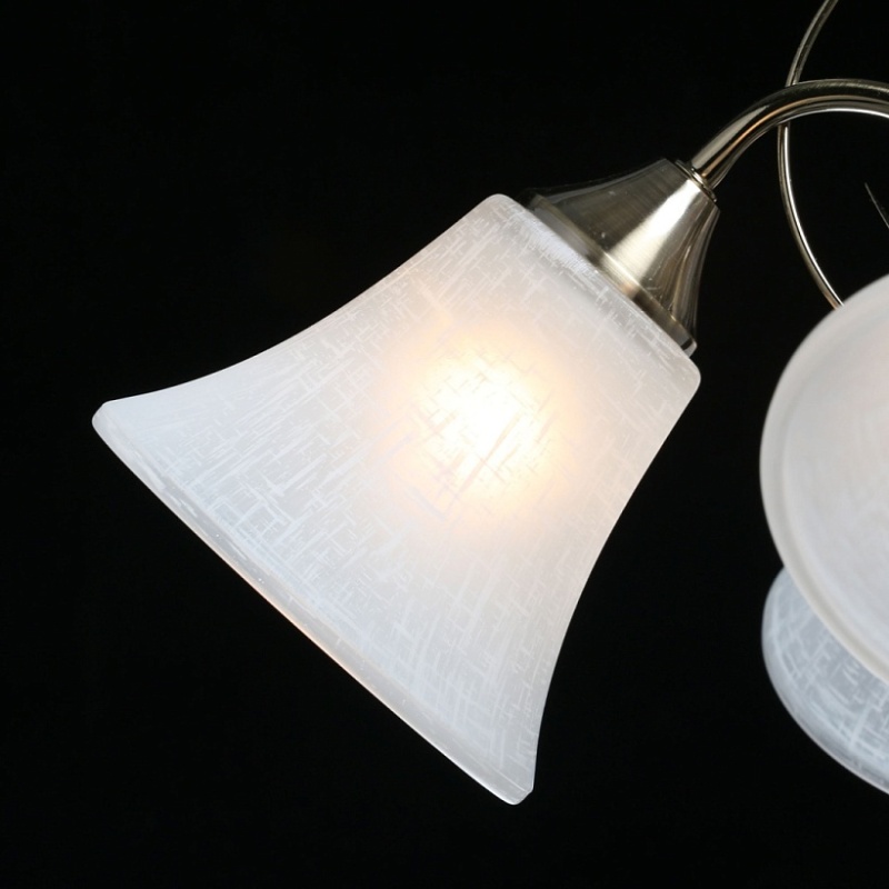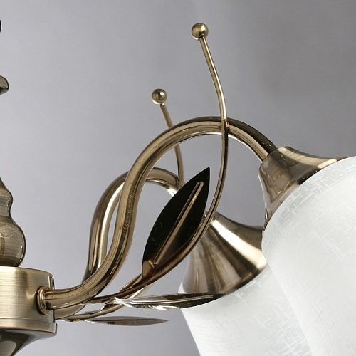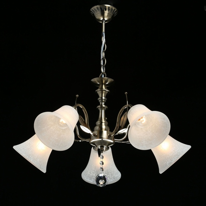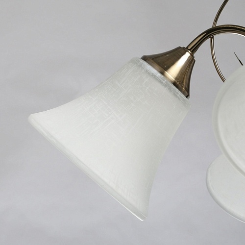 Основание светильника выполнено из металла и гальванизировано в цвет античной бронзы с последующим лакированием. Стеклянные плафоны отлиты в форму и матированы. Светильник декорирован подвесом из хрусталя в форме шара.