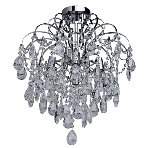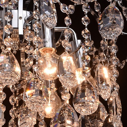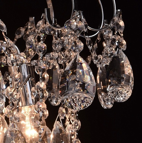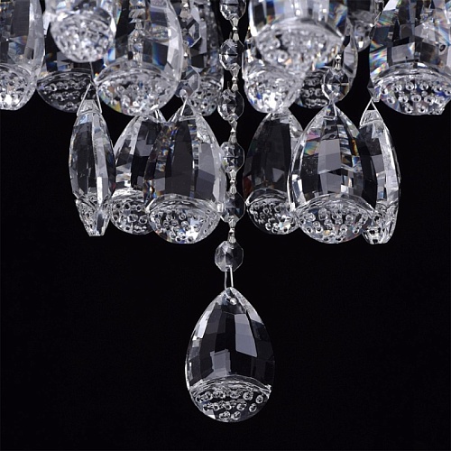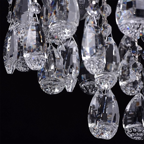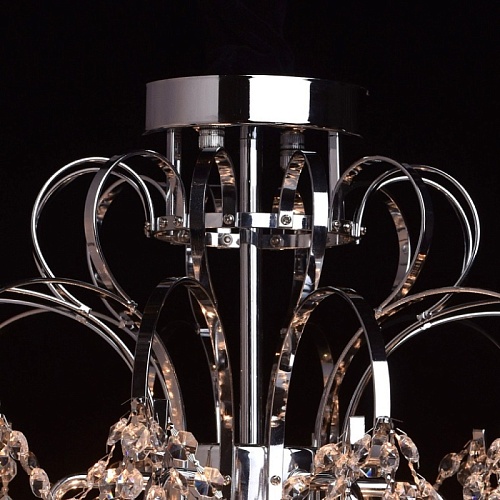 Основание светильника выполнено из металла и гальванизировано в цвет хрома. Светильник декорирован подвесками из прозрачного хрустального стекла миндалевидной формы и формы октагона.