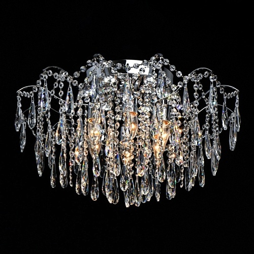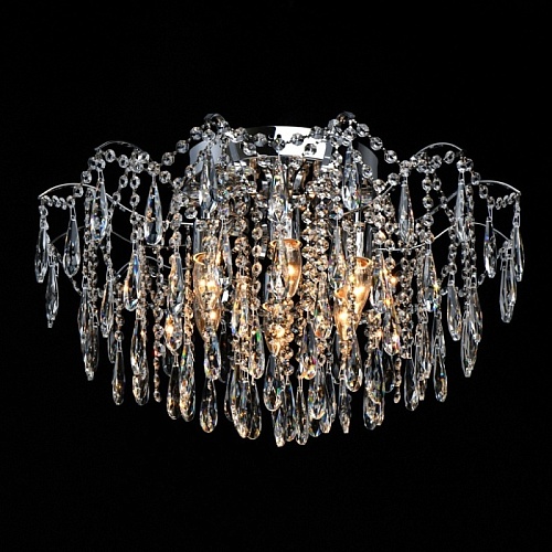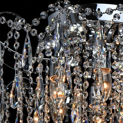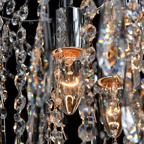 Основание светильника выполнено из металла и гальванизировано в цвет хрома. Светильник декорирован прозрачным хрусталем формы октагон и капля.