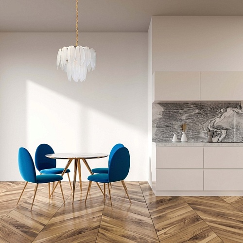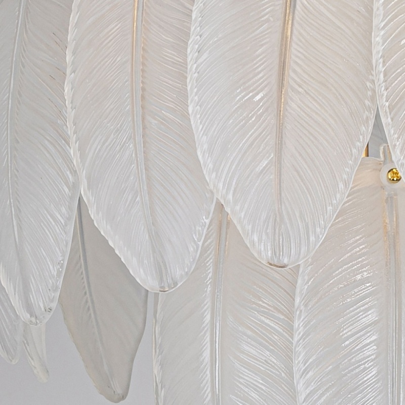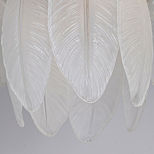 Металлическое основание светильника гальванизировано в цвет золота. Люстра декорирована матированными стеклянными элементами в форме листьев.