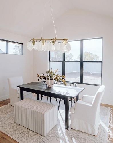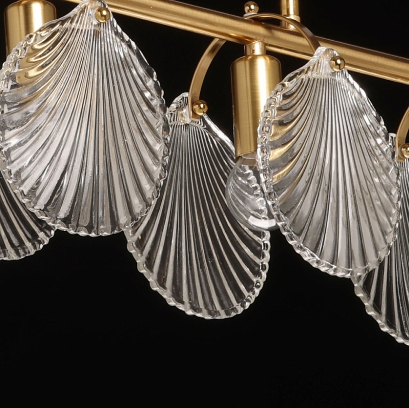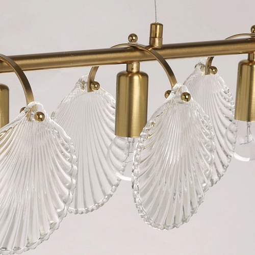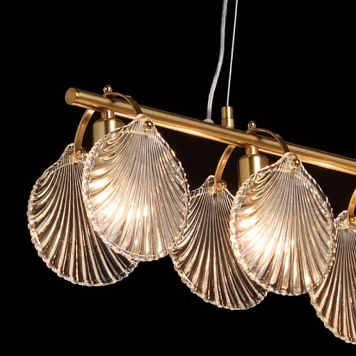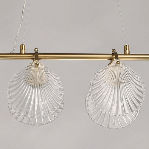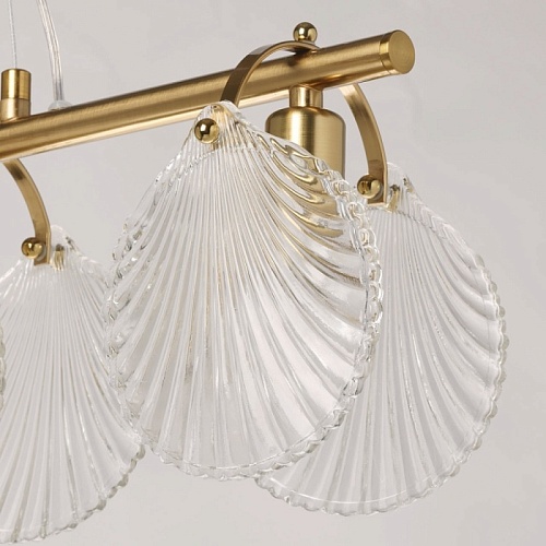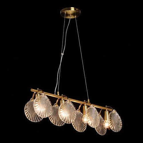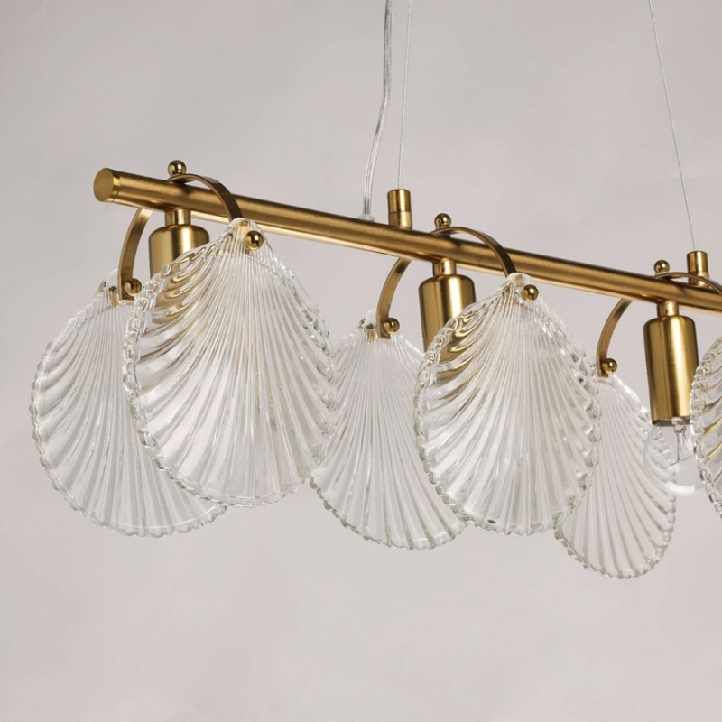 Металлическое основание подвесной люстры гальванизировано в цвет латуни. Источники света закрыты декоративными элеменатми в виде ракушек, отлитыми из прозрачного стекла.
