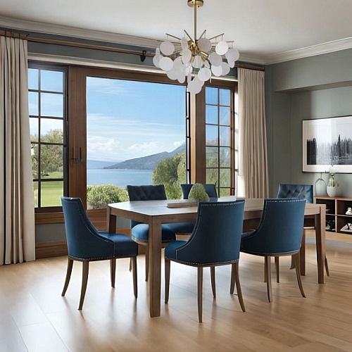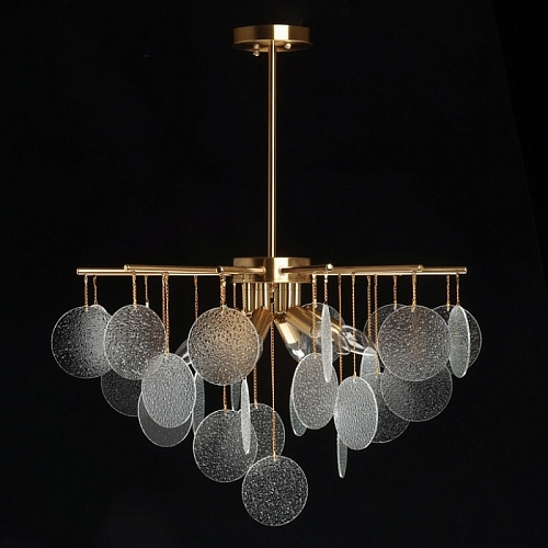 Металлическое основание подвесной люстры гальванизировано в цвет латуни. Люстра декорирована подвесками из фактурного полупрозрачного стекла.