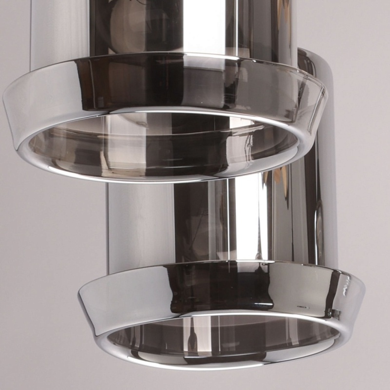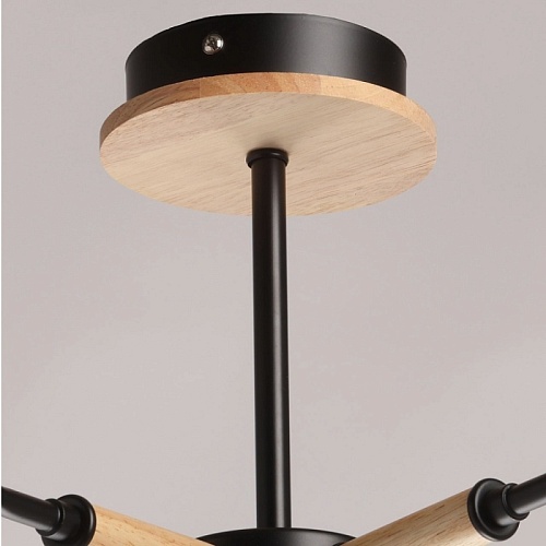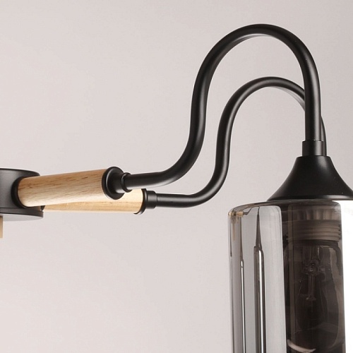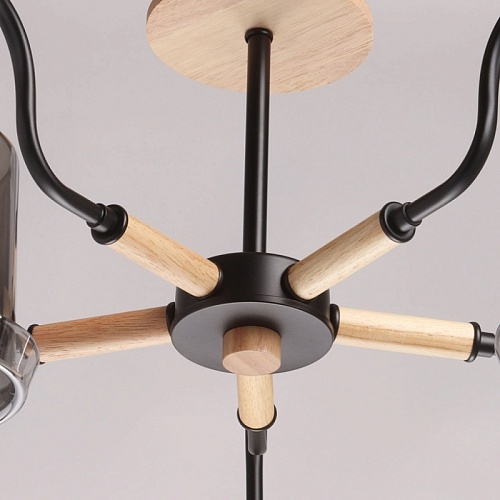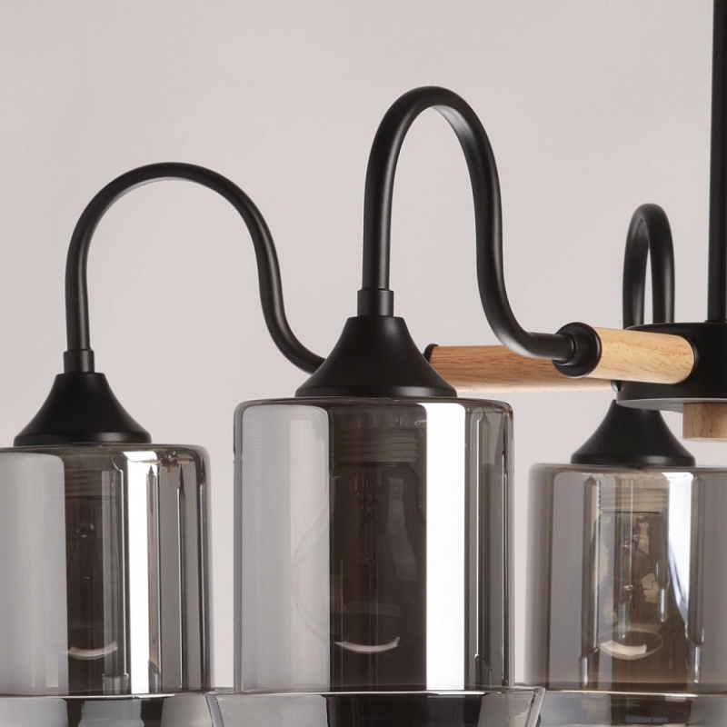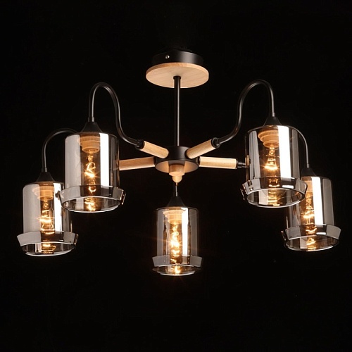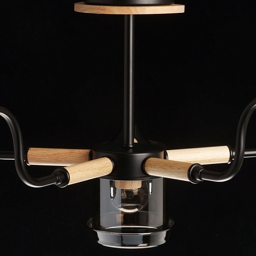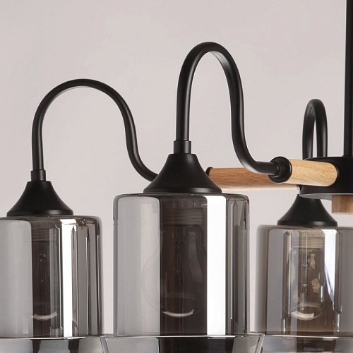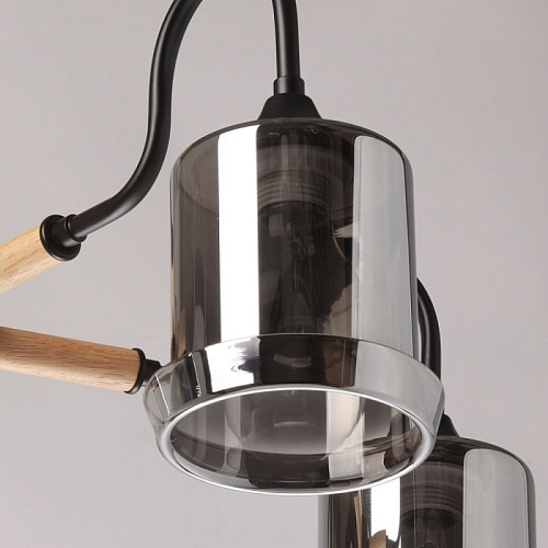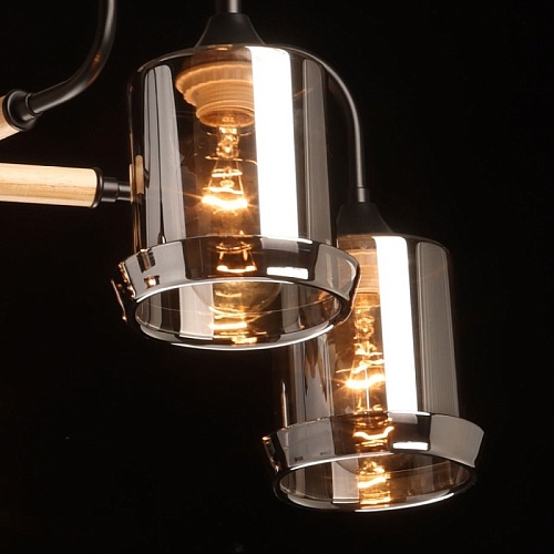 Металлическое основание потолочной люстры окрашено в черный цвет. Стеклянные плафоны отлиты в оригинальную форму и гальванизированы в дымчатый цвет. Потолочная люстра декорирована элементами из натурального светлого дерева.