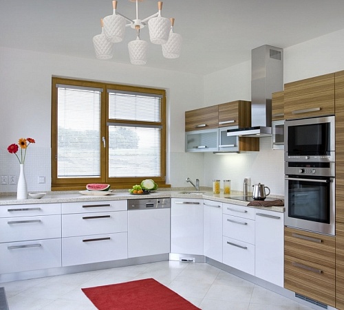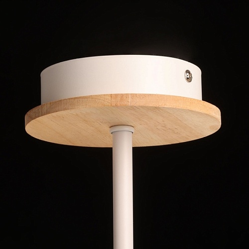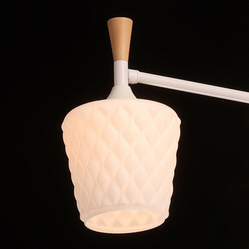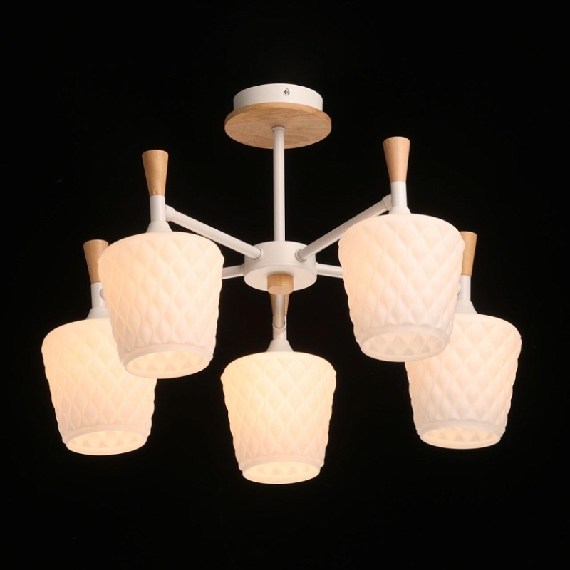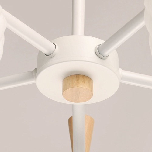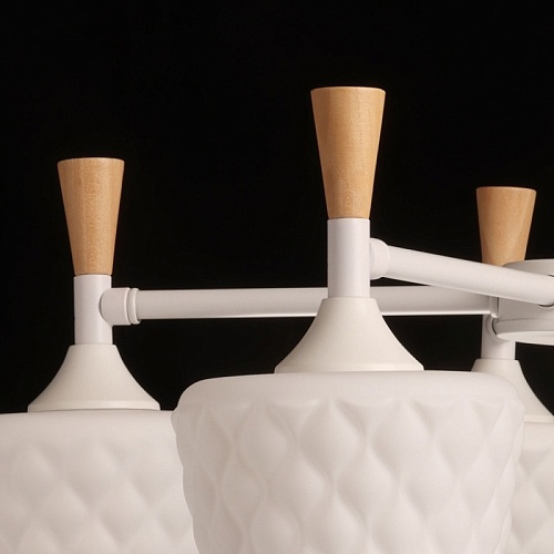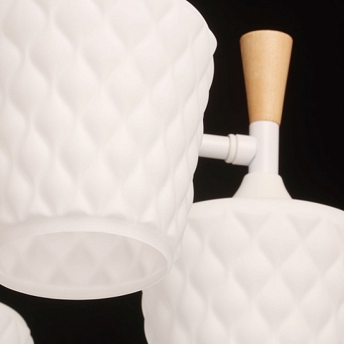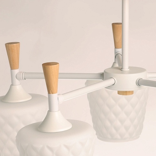 Металлическое основание потолочной люстры окрашено в белый цвет. Фактурные стеклянные плафоны окрашены в белый цвет. Потолочная люстра декорирована элементами из светлого натурального дерева.