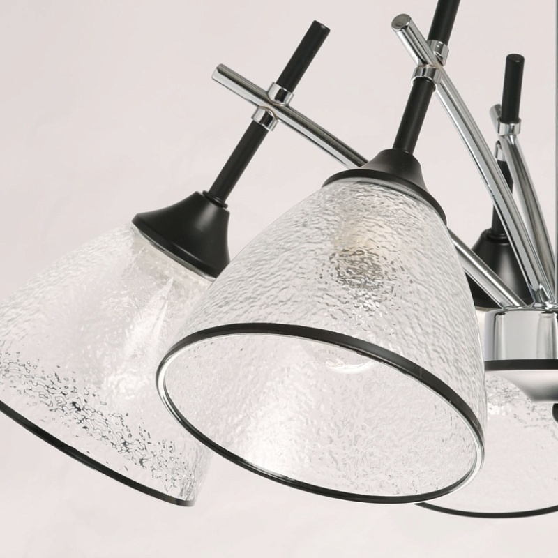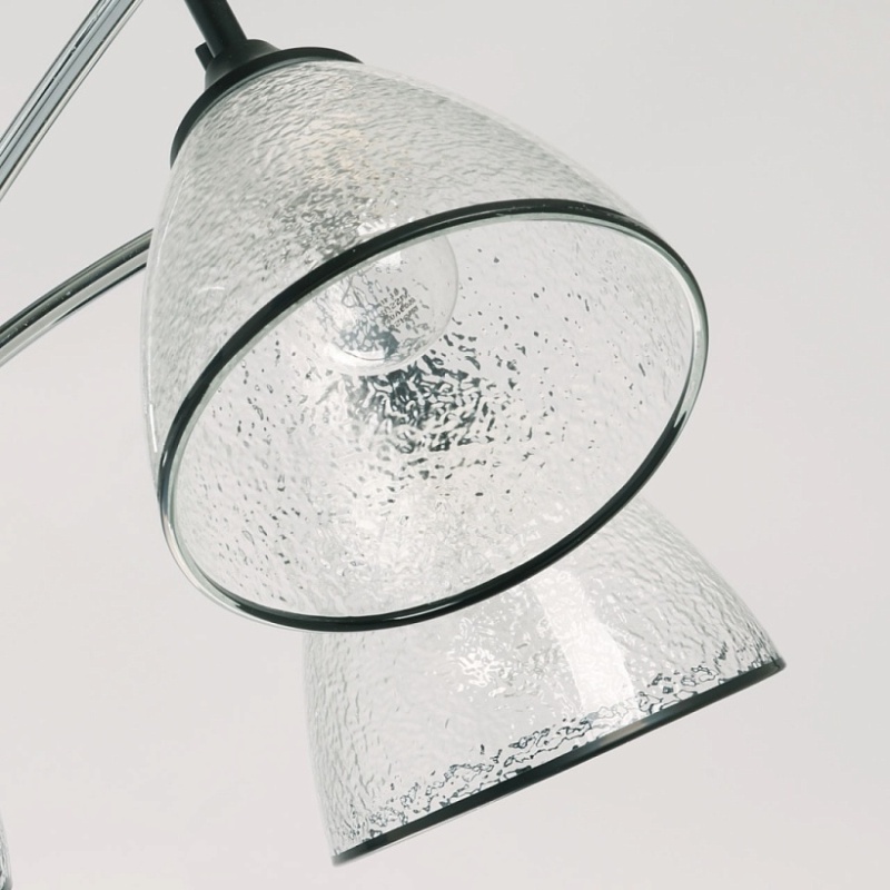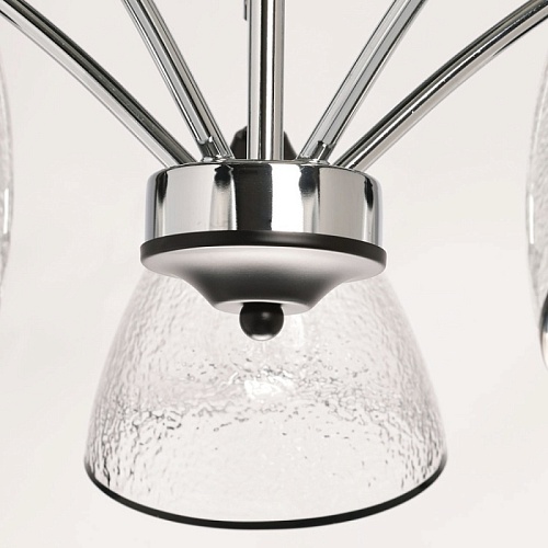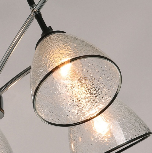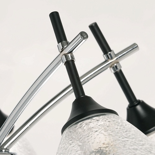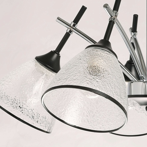 Металлическое основание потолочной люстры гальванизировано в цвет хрома. Отдельные элементы основания окрашены в черный цвет. Плафоны выполнены из прозрачного фактурного стекла и отделаны кантом черного цвета.