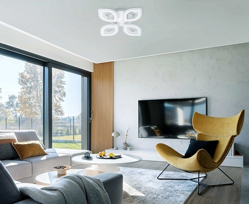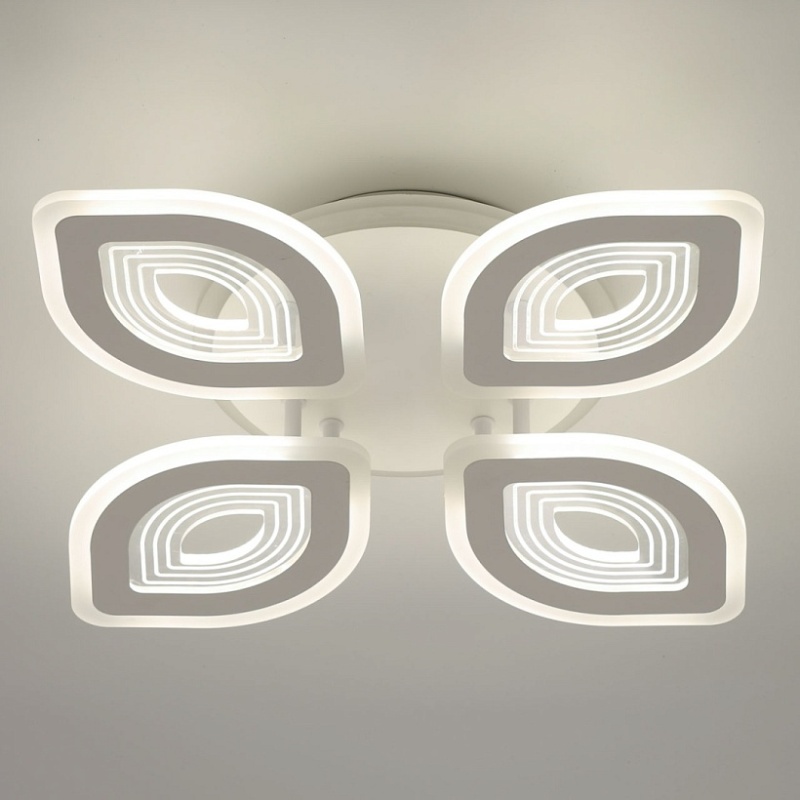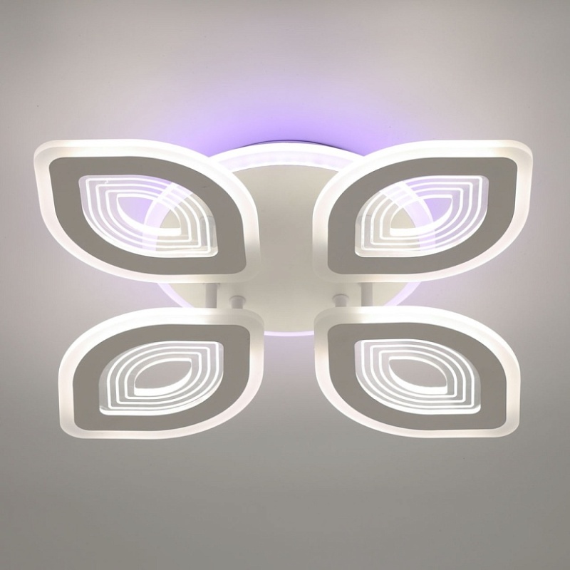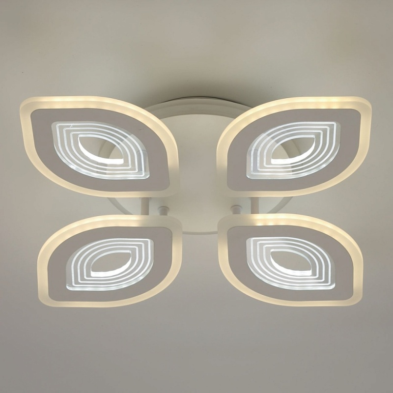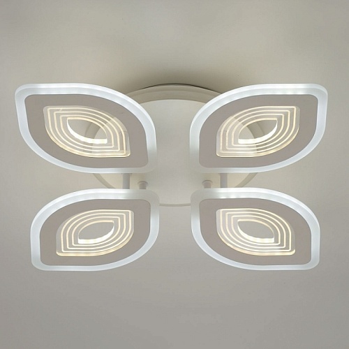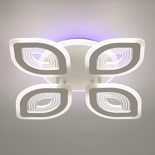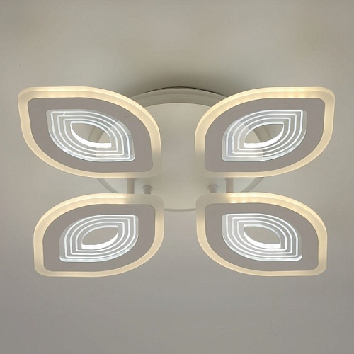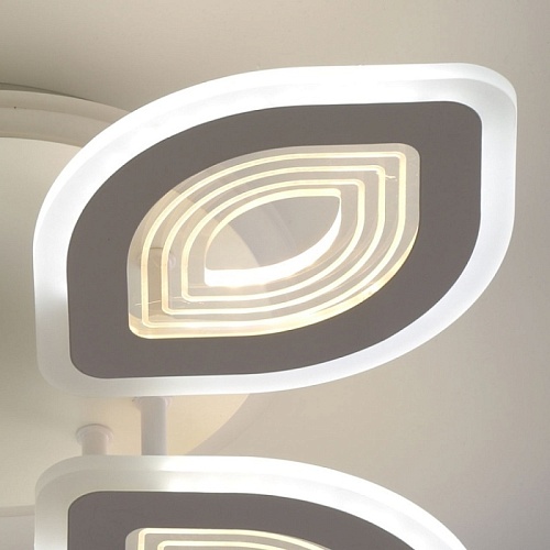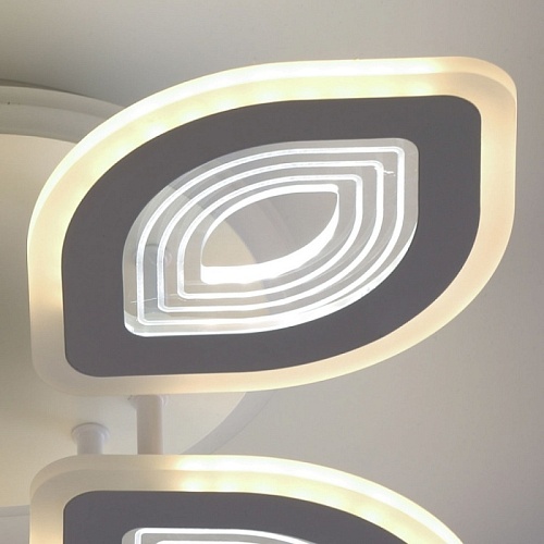 Металлическое основание светильника окрашено в белый цвет. Каркас плафона выполнен из сплава алюминия с цинком и окрашен в цвет основания. Светодиодные источники света закрыты белым матовым и прозрачным акрилом. Дополнительно, в светильнике предусмотрена подсветка потолочной чаши. Светильник приходит в состоянии частичной сборки в компактной упаковке: вся электрика подсоединена, достаточно закрепить плафоны на корпусе.