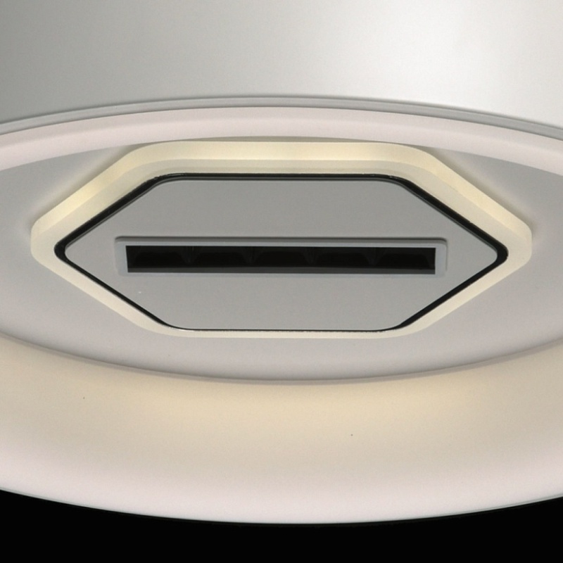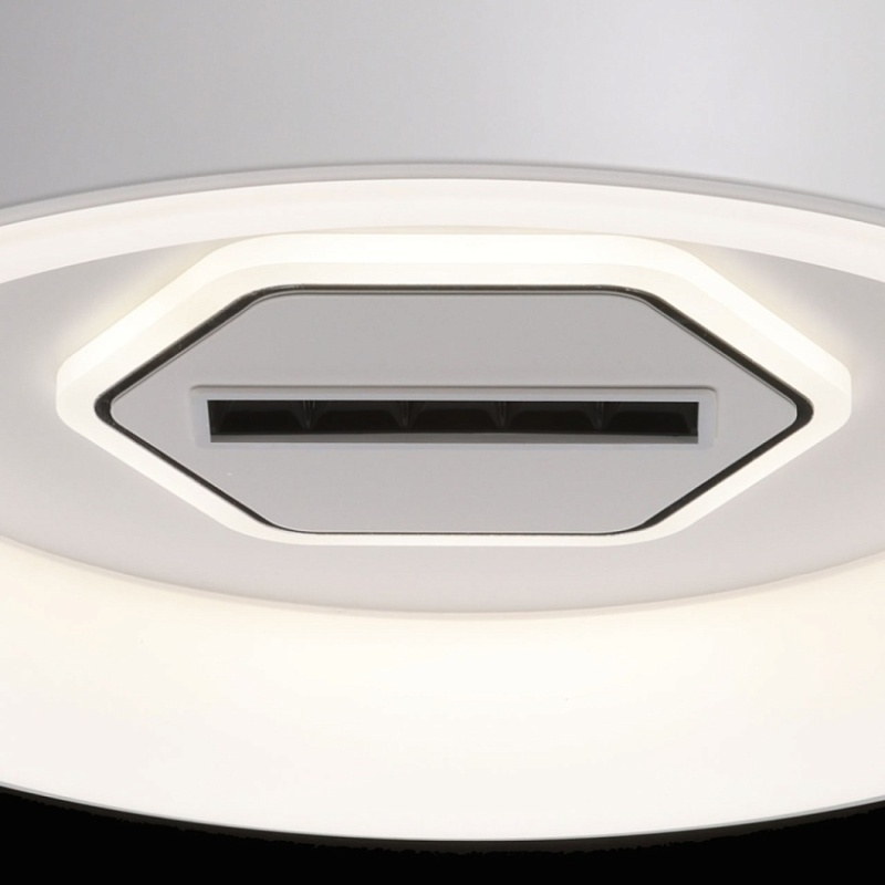 Металлическое основание светильника окрашено в белый цвет. Светодиодные источники света закрыты белым матовым акрилом. В центр светильника, выделенного металлическим кантом, гальванизированным в цвет хрома, на пластине из сплава алюминия, окрашенной в металлический цвет, встроены 5 светодиодов функционального освещения. В комплект входит пульт.