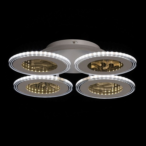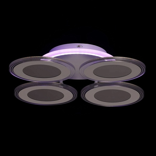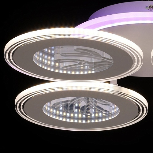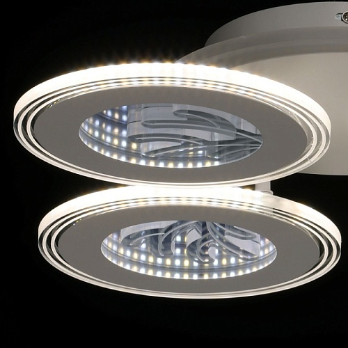Металлическое основание потолочной люстры окрашено в белый цвет. Корпус плафонов выполнен из сплава алюминия с цинком и окрашен в цвет основания. Светодиодные источники света закрыты белым матовым акрилом. Люстра декорирована прозрачным акрилом с 3D-эффектом.