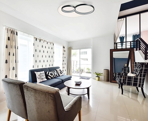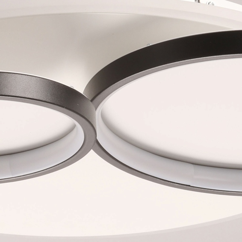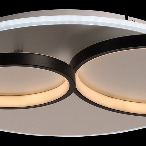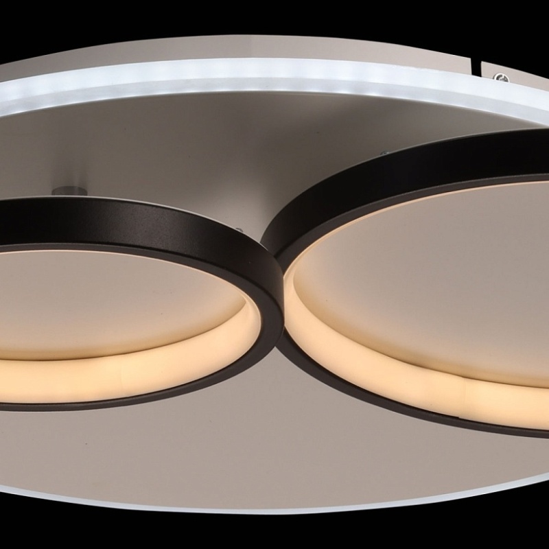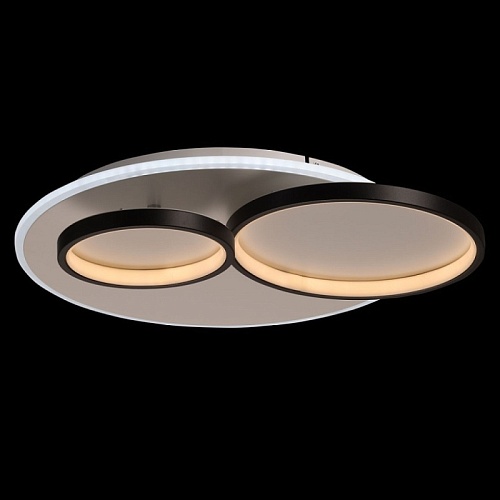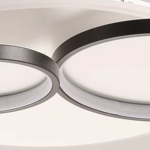 Металлическое основание потолочной люстры окрашено в белый цвет. Корпус плафона выполнен из сплава алюминия с цинком и окрашен в черный цвет. Светодиодные источники света на основании закрыты матовым акрилом, на плафоне - силиконом белого цвета. Плафоны крепятся на шарнирах и поворачиваются в горизонтальной плоскости.