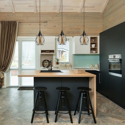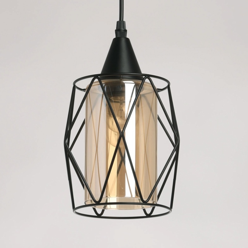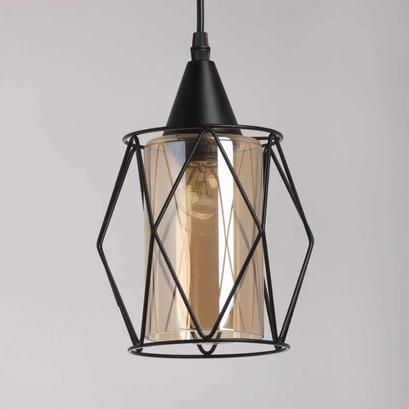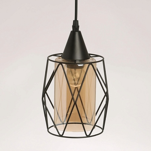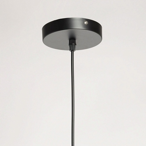 Металлическое основание подвеса окрашено в черный цвет. Источник света закрыт двойным плафоном. Внешний плафон геометричной формы выполнен из металла и окрашен в цвет основания. Внутренний плафон отлит из стекла, гальванизированного в цвет шампань.
