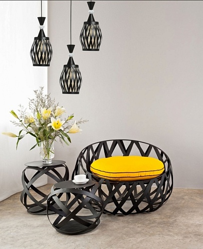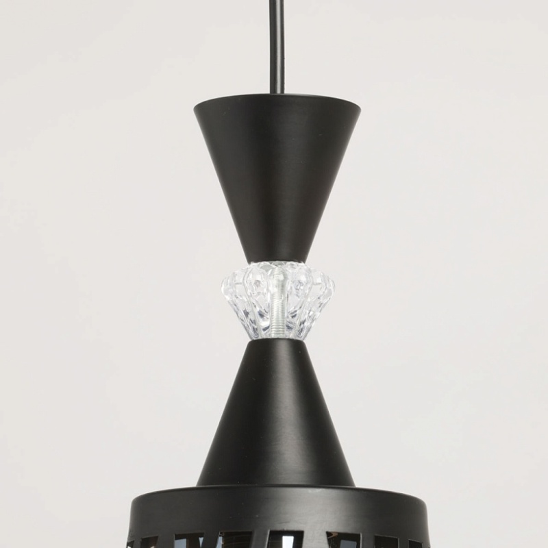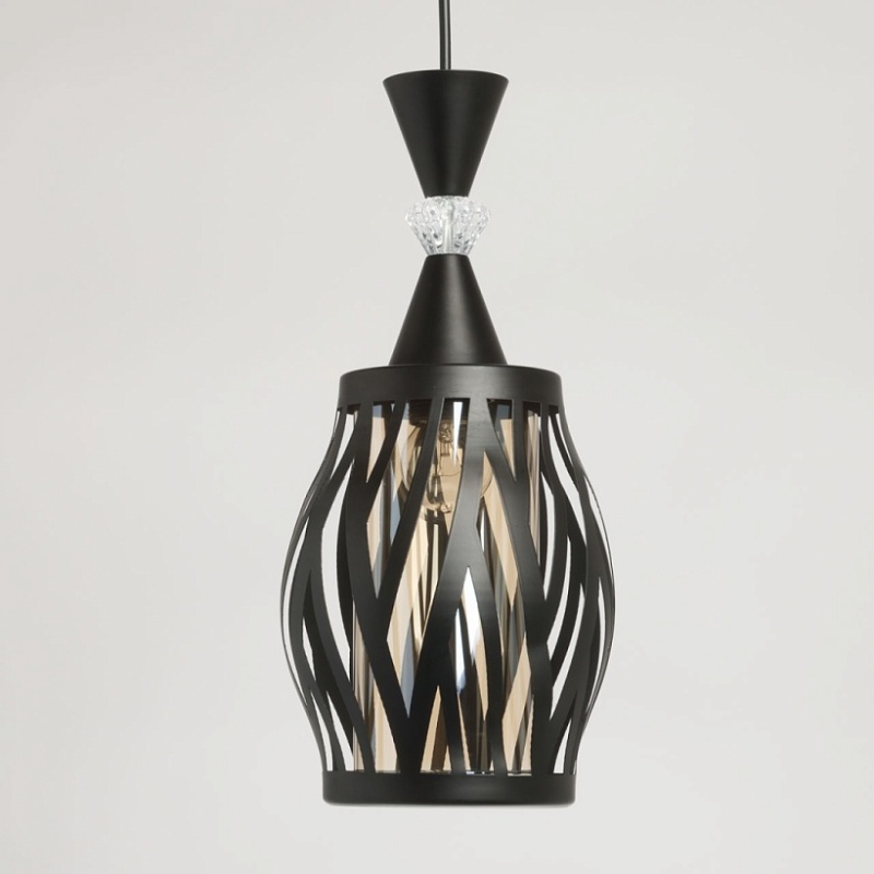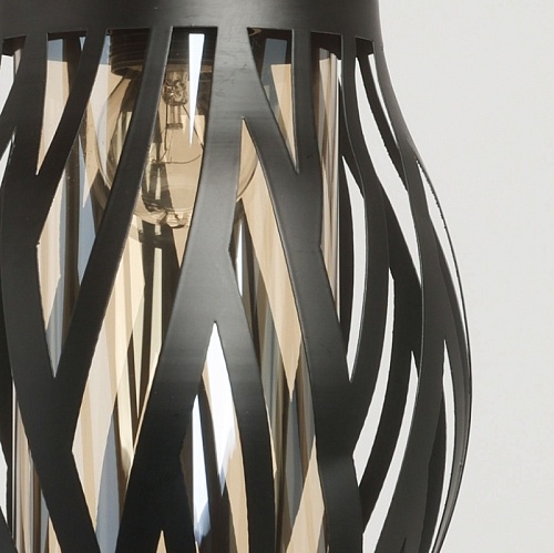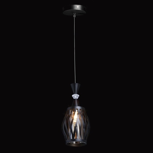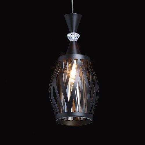 Металлическое основание подвеса окрашено в черный цвет. Источник света закрыт двойным плафоном. Внешний фигурный плафон выполнен из металла и окрашен в цвет основания. Внутренний плафон отлит из стекла, гальванизированного в цвет шампань. Подвес декорирован элементом из прозрачного стекла